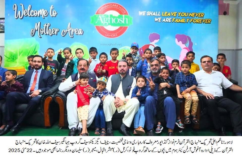 "انہوں نے کرنل(ر) مبشر اقبال اور ان کی پوری ٹیم کو خراج تحسین پیش کرتے ہوئے کہا کہ اس ادارے کا نظم و ضبط، صفائی، سیکیورٹی اور تربیت کا معیار بین الاقوامی سطح کا ہے۔ اُنہوں نے کہا کہ ادارہ آغوش آرفن کیئر ہوم منہاج القرآن کی خدمتِ خلق کی سوچ کا عملی مظہر ہے۔ناظم اعلیٰ منہاج القرآن انٹرنیشنل خرم نواز گنڈاپور نے بھی اس موقع پر گفتگو کرتے ہوئے کہا کہ تحریک منہاج القرآن شیخ الاسلام ڈاکٹر محمد طاہرالقادری کی قیادت میں فلاح انسانیت کے ایسے پراجیکٹس کو فروغ دے رہی ہے جو مستحق بچوں کو نہ صرف پناہ دیتے ہیں بلکہ اُنہیں عزت، تعلیم، کردار اور مستقبل کی سمت بھی فراہم کرتے ہیں۔ اُنہوں نے کہا کہ آغوش منہاج القرآن کے ویژن کا عکاس ہے۔