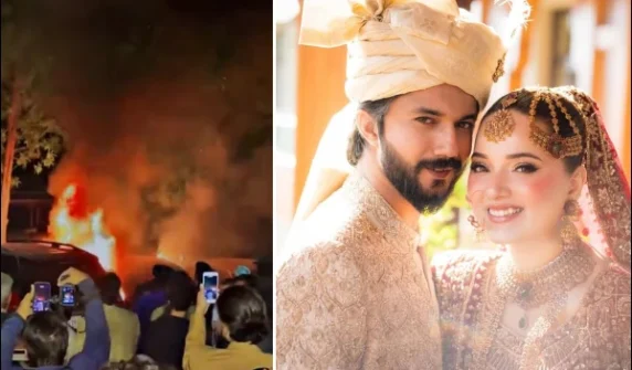 تقریب کے دوران شادی ہال کی پارکنگ میں کھڑی ایک گاڑی اچانک آگ کے شعلوں میں لپٹ گئی۔ دیکھتے ہی دیکھتے شعلے بلند ہونے لگے اور موقع پر موجود افراد حیران و پریشان اس منظر کو اپنے موبائل فون کیمروں میں قید کرنے لگے۔ چند لمحوں میں یہ ویڈیوز سوشل میڈیا پر پھیل گئیں اور ربیکا خان کی شادی ایک بار پھر ٹرینڈز کی زینت بن گئی۔